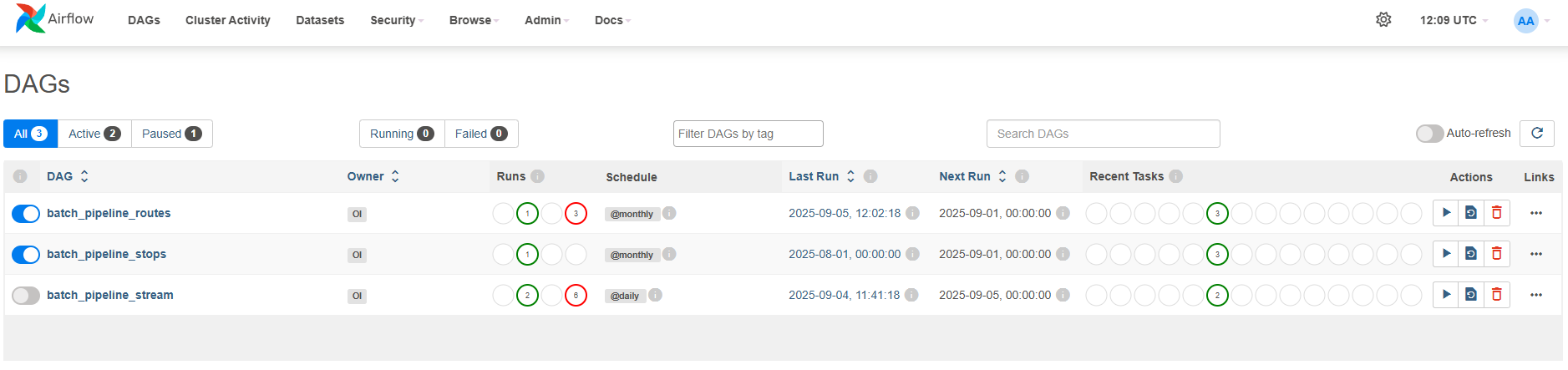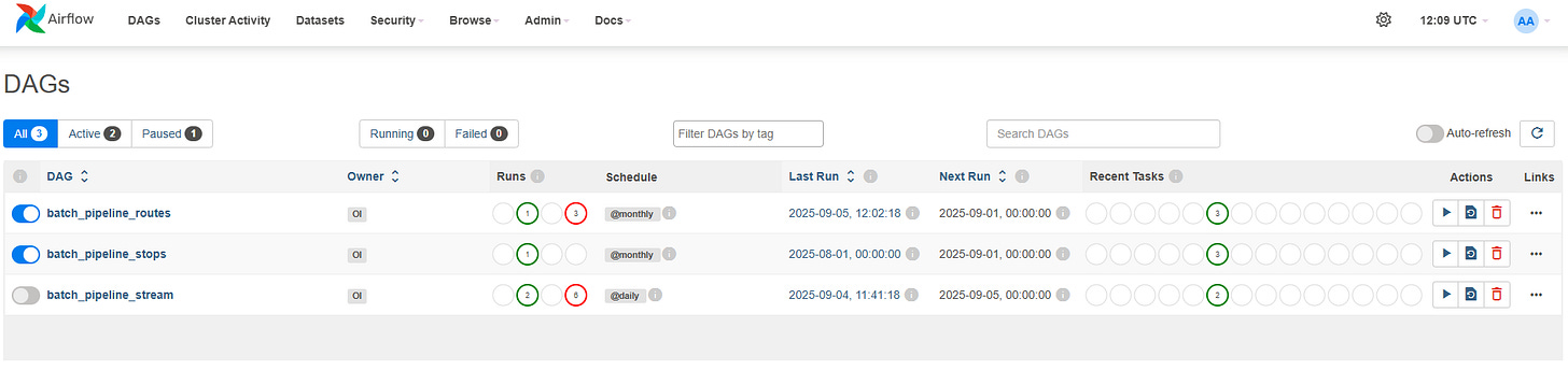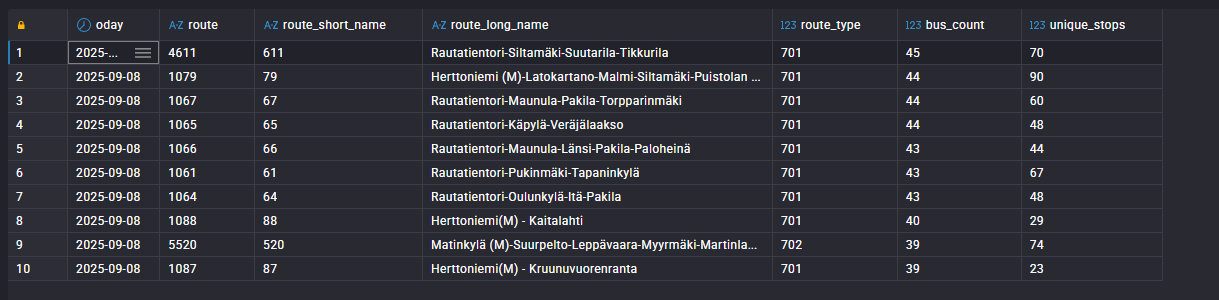 SELECT f.oday, r.route_short_name, r.route_long_name, ROUND(AVG(f.dl) / 60, 2) AS avg_delay_min FROM hdw.fact_vehicle_position f JOIN hdw.dim_routes r ON f.route_id = r.route_id AND r.active_flg = 1 WHERE f.oday = DATE ‘2025-09-08’ GROUP BY f.oday, r.route_short_name, r.route_long_name ORDER BY avg_delay_min DESC LIMIT 10Or we can go to the Bronze layer and check for missing events or data loss.