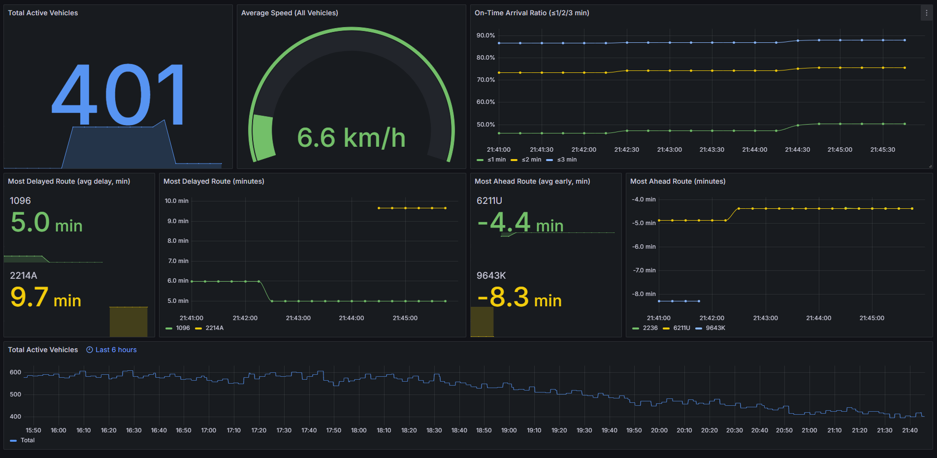 Total active vehicles, average speed, on-time ratios (≤1/2/3 min), and the current most delayed and most ahead routes by average delay update in near real time.