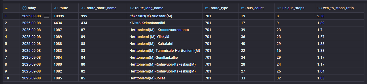 SELECT f.oday, f.route, r.route_short_name, r.route_long_name, r.route_type, COUNT(DISTINCT f.vehicle_number) AS bus_count, COUNT(DISTINCT f.stop) AS unique_stops, ROUND( CAST(COUNT(DISTINCT f.vehicle_number) AS DOUBLE) / CAST(COUNT(DISTINCT f.stop) AS DOUBLE), 2 ) AS veh_to_stops_ratio FROM hdw.fact_vehicle_position f JOIN hdw.dim_routes r ON f.route_id = r.route_id AND r.active_flg = 1 WHERE f.oday = DATE ‘2025-09-08’ GROUP BY f.oday, f.route_id, f.route, r.route_short_name, r.route_long_name, r.route_type ORDER BY veh_to_stops_ratio DESC LIMIT 10;Which routes experienced the most delays?