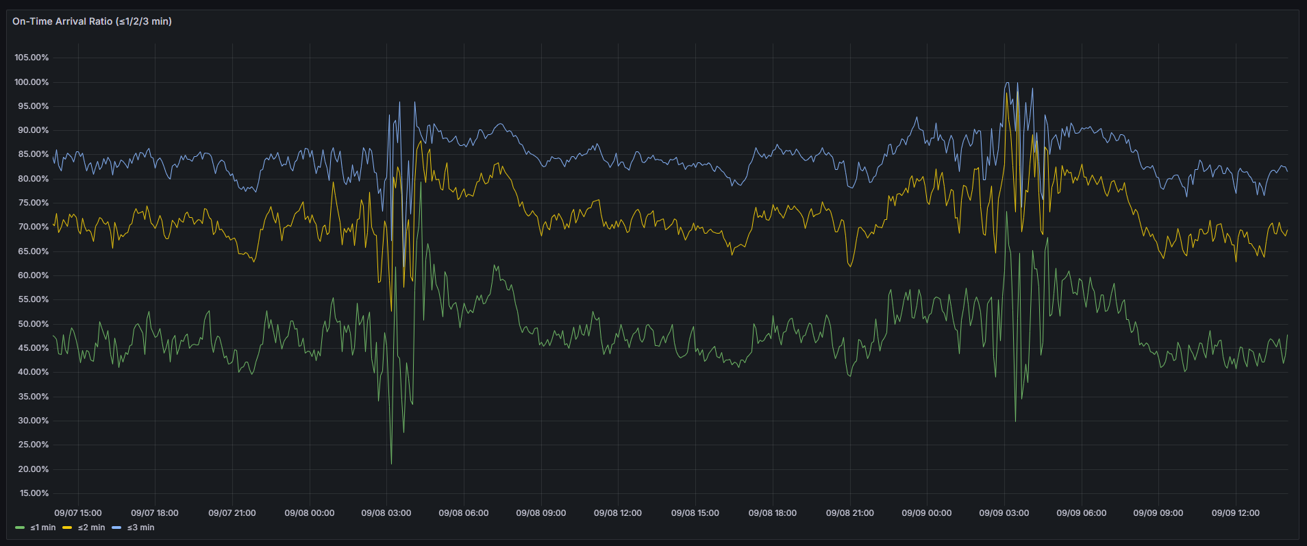 PCT_ON_TIME_3.set(float(row[”on_time_3”] or 0.0))Optional route extremes (most delayed and most ahead in the latest window):