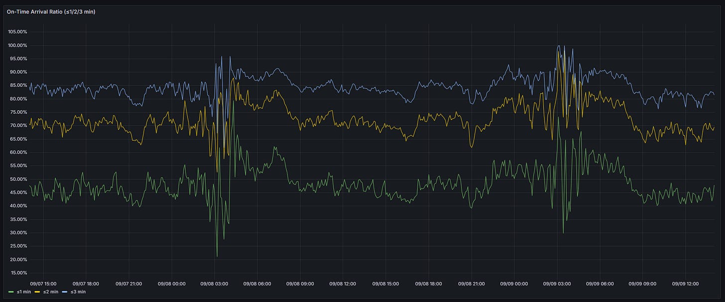Within 2 min: Around 70–75% stay within two minutes of schedule